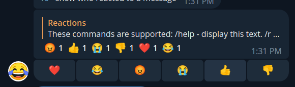 Telegram finally introduced native emoji reactions in December 2021, so I took the server for this bot offline. But the code is still there, if you’re interested in contorting the Telegram API in ways that defy its creators.